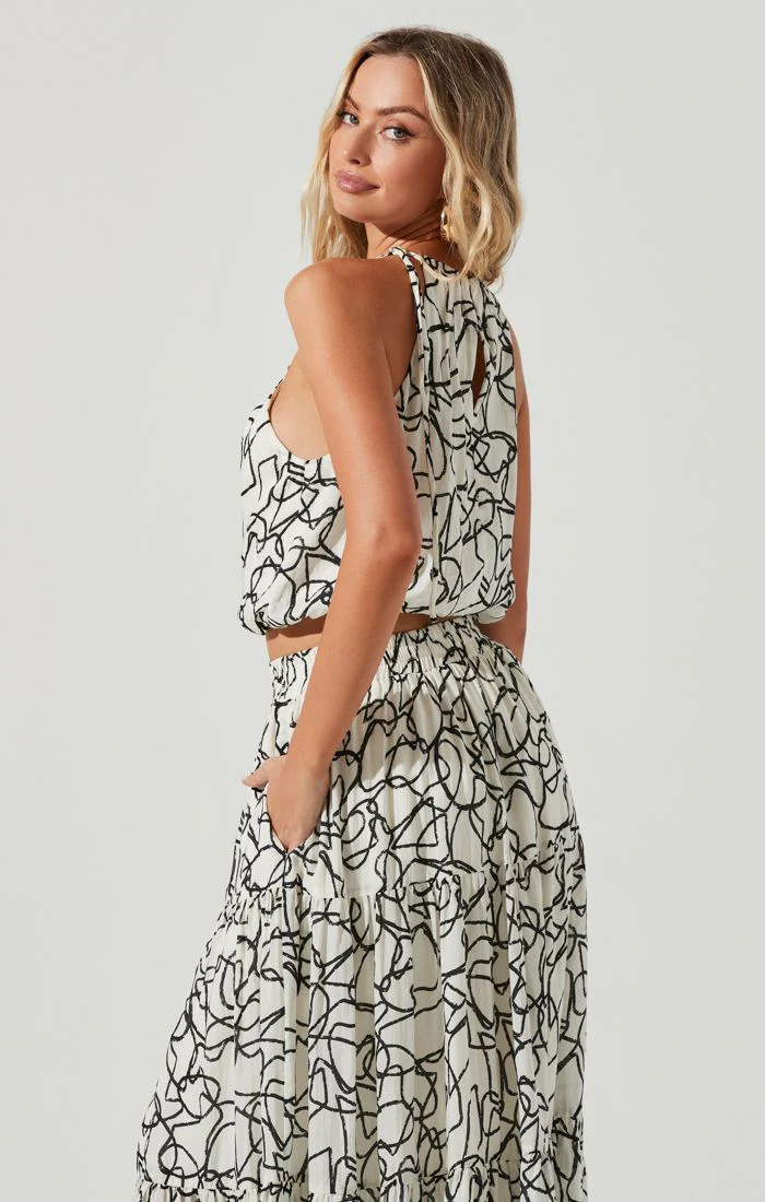 Decorated with a graphic abstract print, this halter neck, sleeveless top is a standout. An adjustable tie neck ensures a perfect fit whether you're wearing it with your favorite pair of denim shorts or the coordinating CECILE MAXI SKIRT!