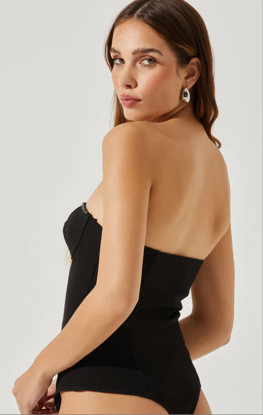 The ASTR The Label Chastine Bodysuit is the perfect combination of style and luxury. An elegant sweetheart neckline in a strapless design is complemented by a hidden side zip closure and flattering bustier structure. Adorned with a delicate row of dazzling rhinestone detail, this bodysuit adds a touch of sparkle to your wardrobe. Slip into luxury and close the night in style.