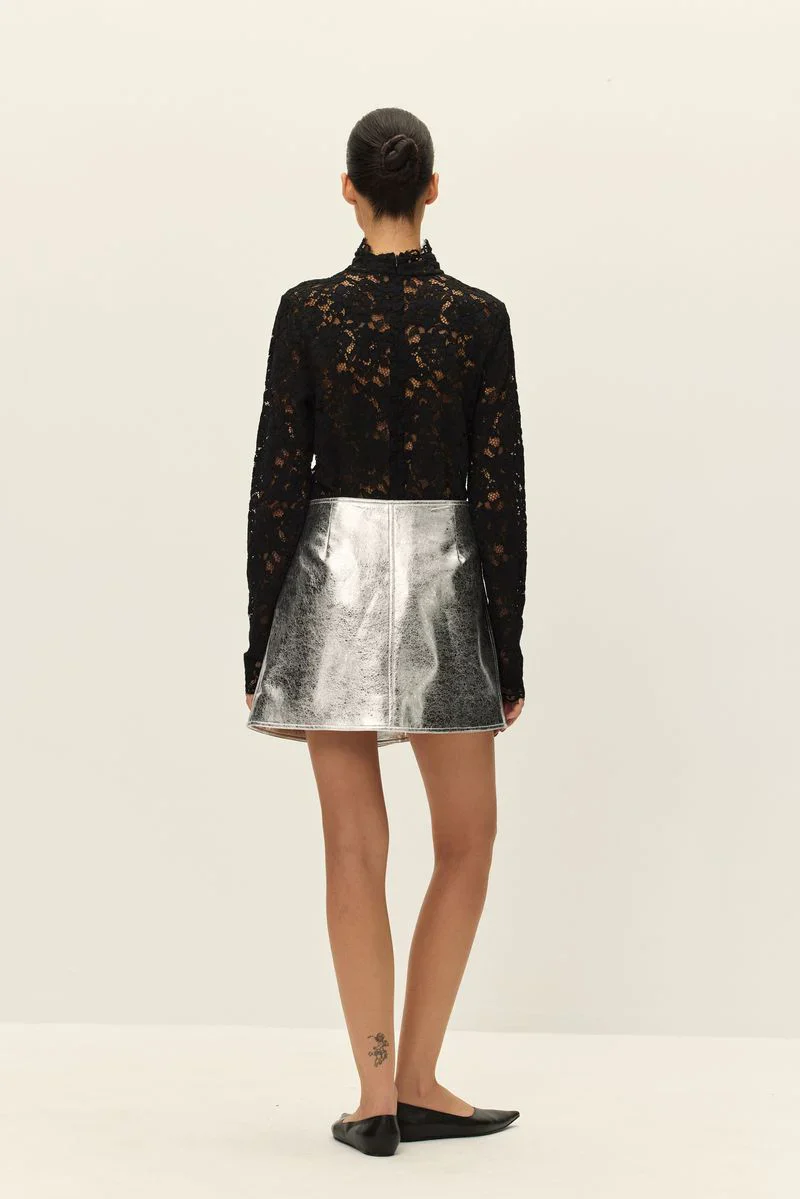 The Tau mini skirt is an absolute must-have for your wardrobe rotation. Crafted in luxe vegan leather with a stunning silver finish, this wrap-style piece drapes beautifully and creates the most flattering silhouette. Functional patch front pockets add that perfect touch of practicality without compromising the sleek aesthetic. Dress it up with heels and a blazer or keep it casual with sneakers and a teeāthis versatile skirt transitions seamlessly from day to night.