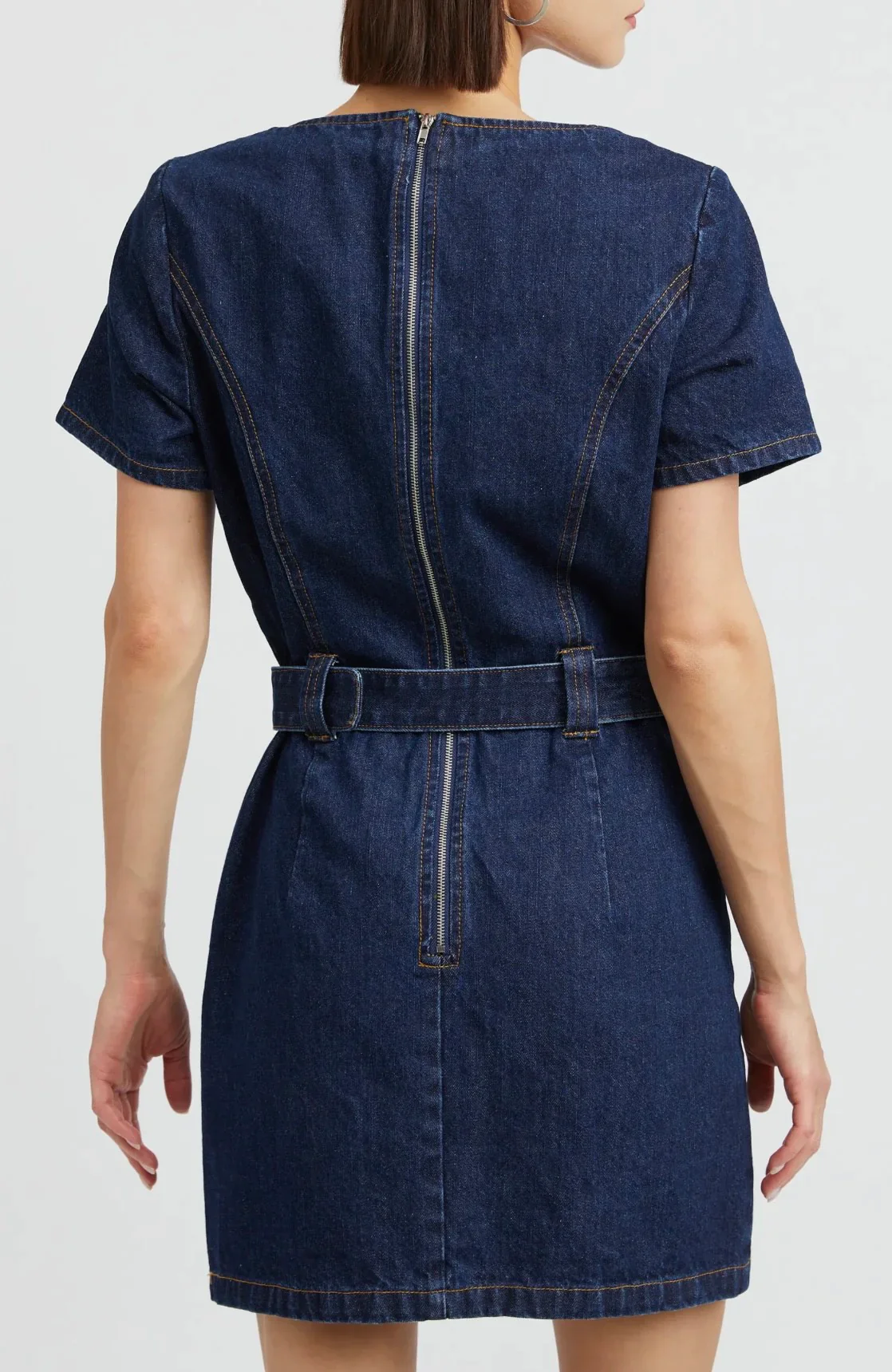 Get ready for a playful summer in the EN SAISON June Denim Mini Dress! With a belted waist, princess seams, and an exposed back zipper, this dress is both flattering and functional. The square neckline and short sleeves add a touch of retro charm. Perfect for sunny days or warm nights.