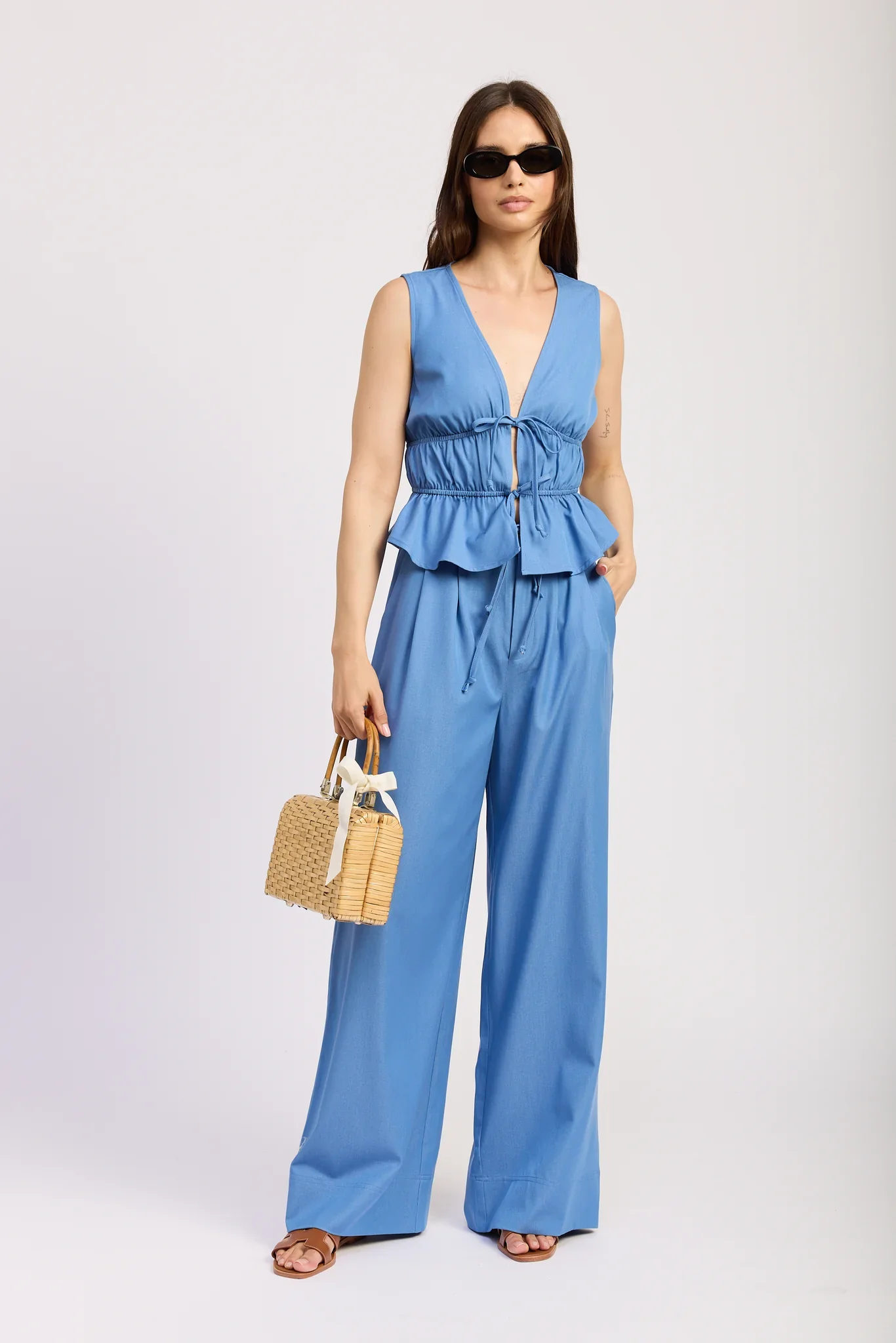 Slip into summer-ready style with our EN SAISON Liana Chambray Top! This flirty sleeveless number features a flattering v-neck and playful double tie detail that shows just the right amount of skin. The elastic waist hugs in all the right places, creating a silhouette that's both comfortable and chic.