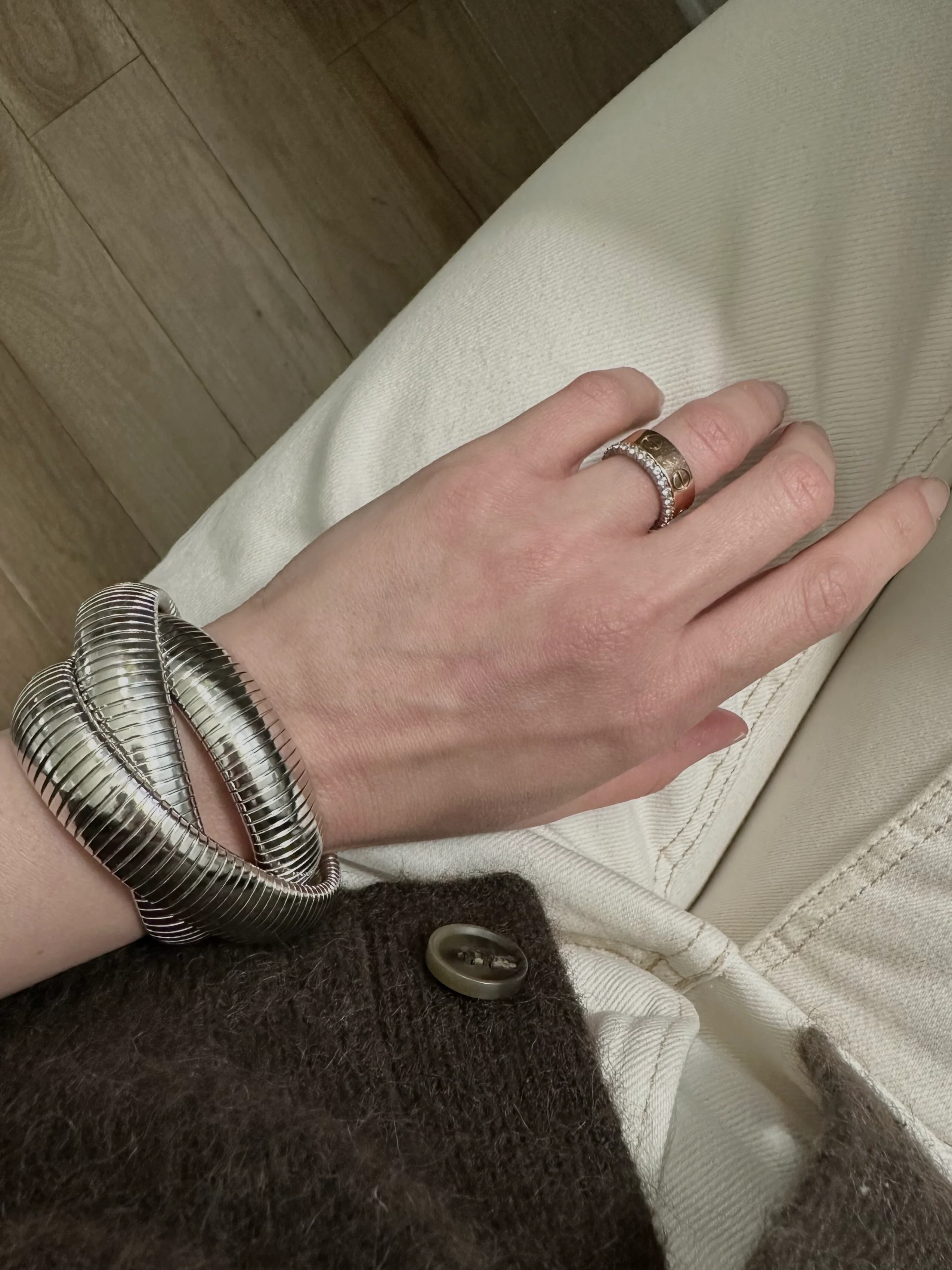 The JANIS SAVITT Triple Cobra Bracelet is crafted from high-polished, rhodium-plated brass, featuring three flexible interlocking bands that expand to fit most wrist sizes. With each band measuring 5/8" wide, this bracelet is a versatile piece made to be stacked and worn in multiples for maximum impact.