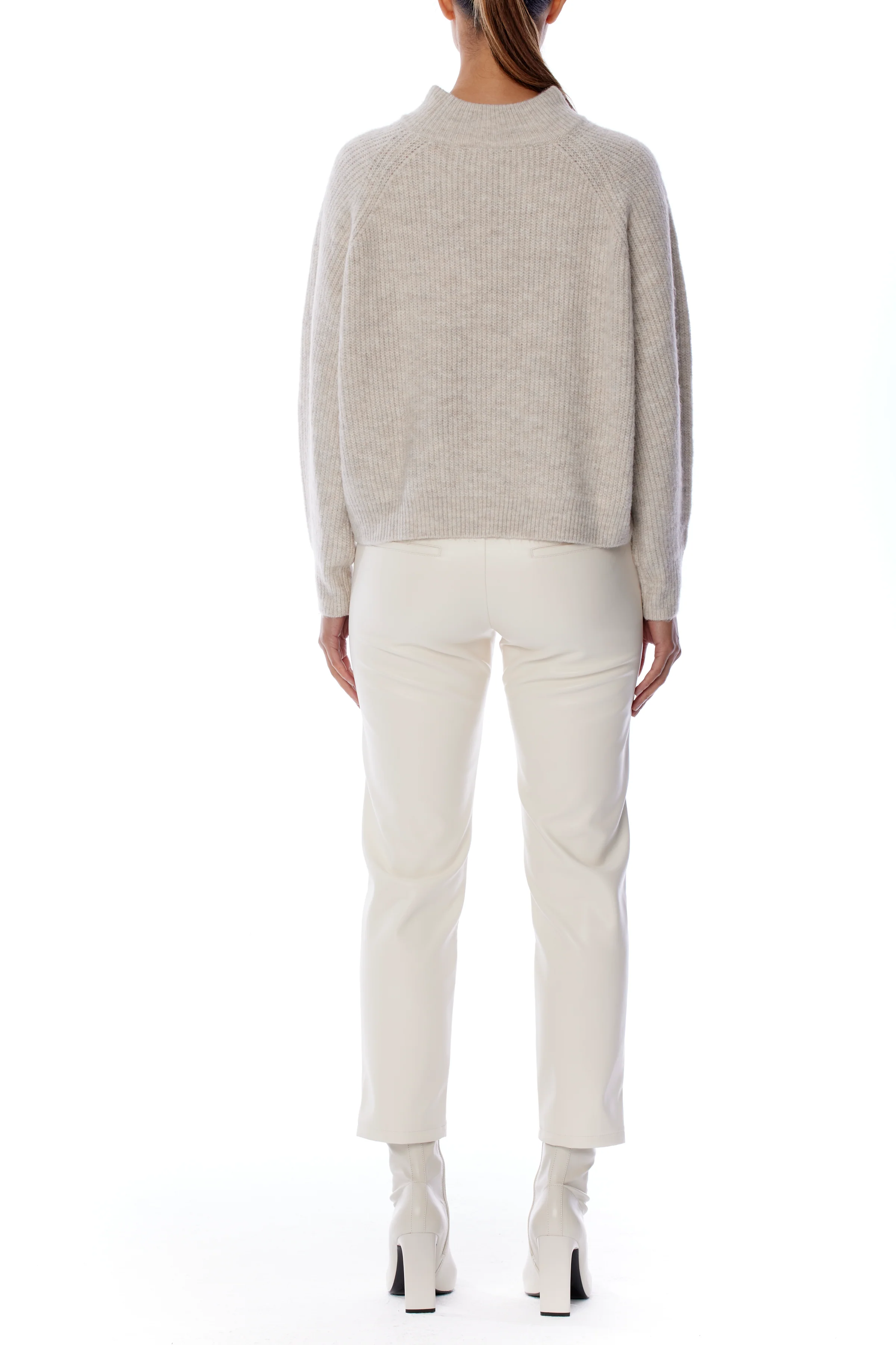 Margaux is a relaxed-fit, long sleeve knit sweater with a mock turtleneck and chunky stitch detailing.