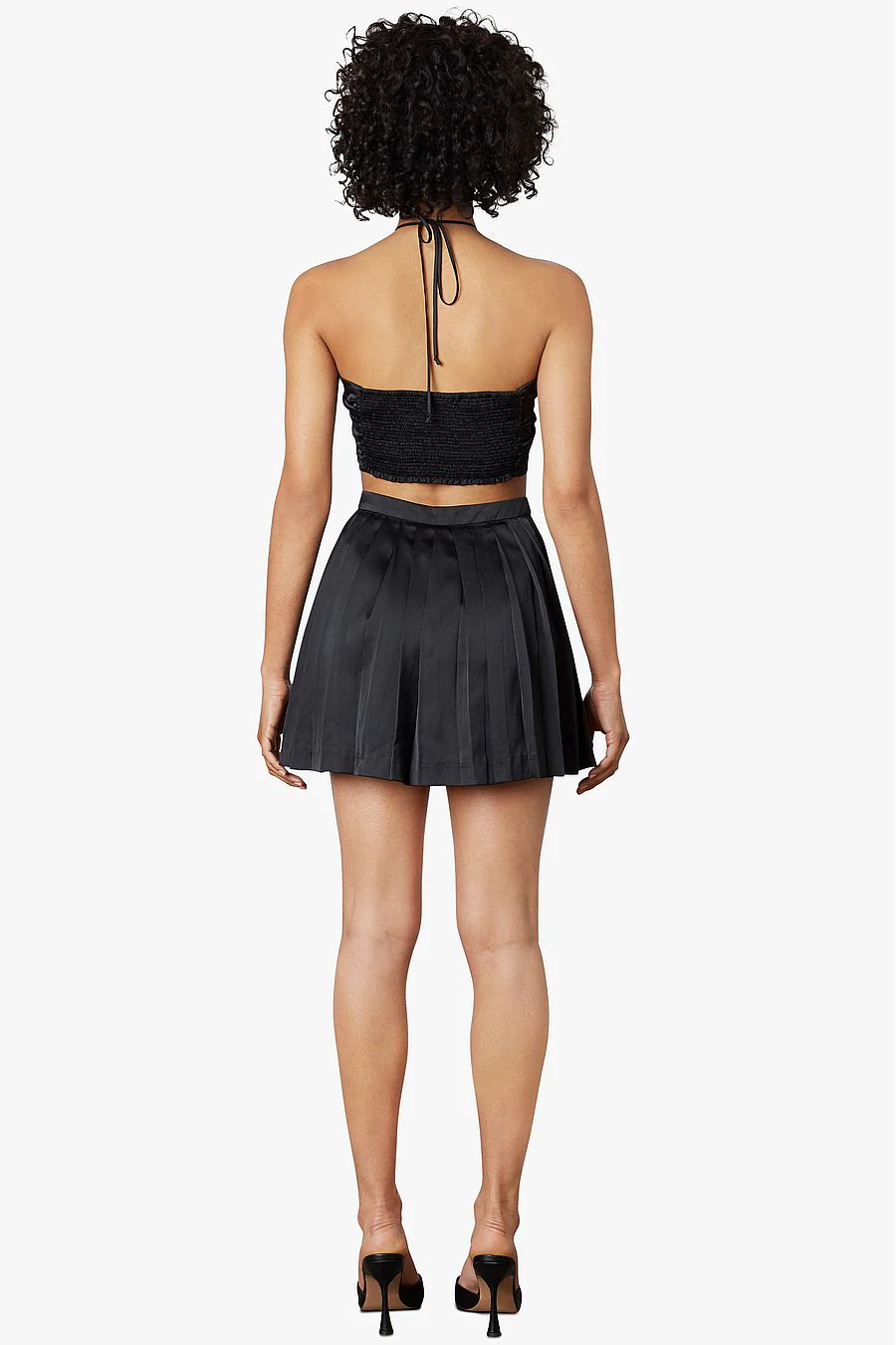 Bobbi is a soft, satin pleated skort with a size zip closure and hidden shorts underneath it all. Be bold and pair her with the coordinating LERA CORSET or play with contrast and balance an oversized CHUNKY SWEATER with the mini-skirt/skort.
