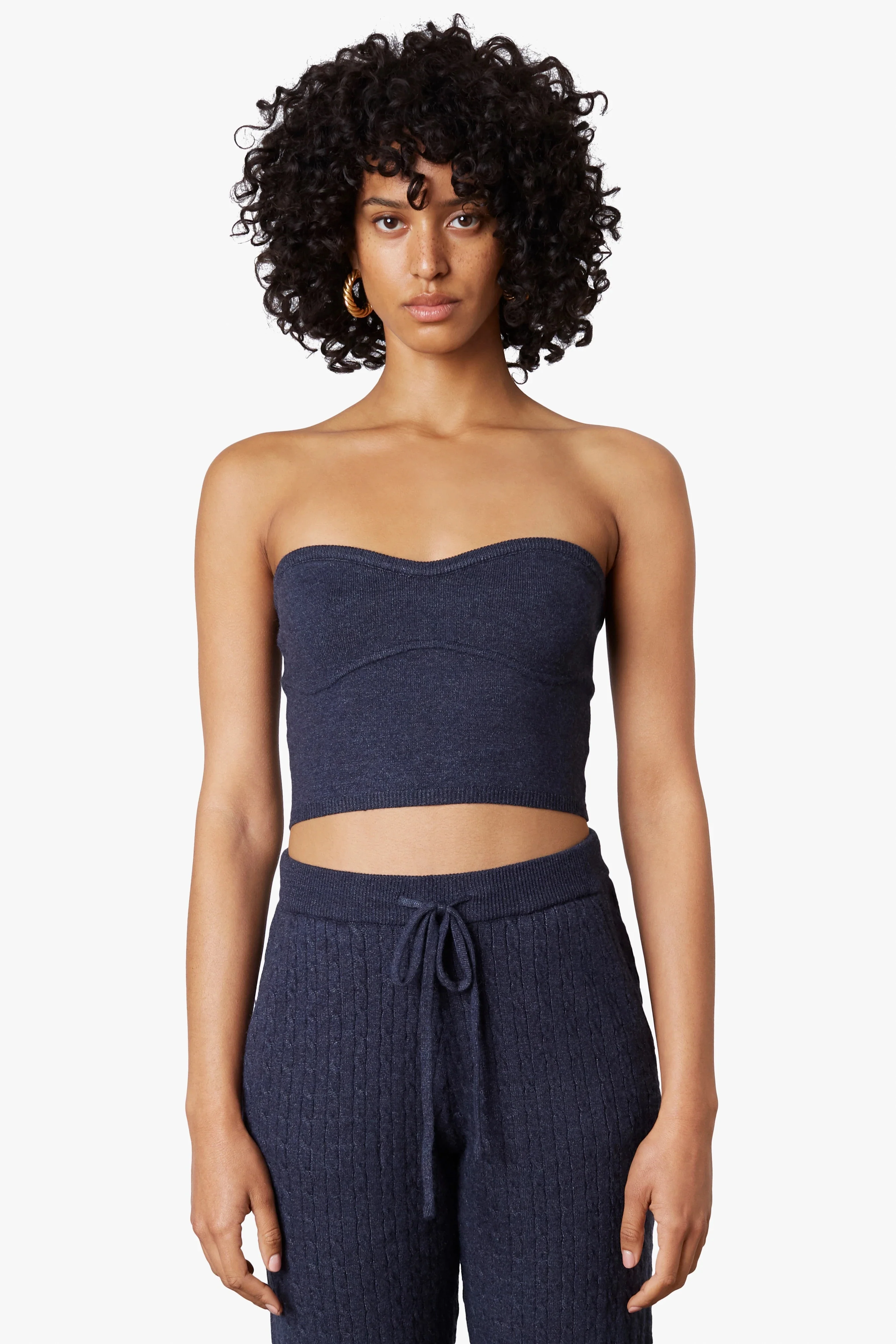 A two piece cableĀ knit sweater set that includes: a cropped, strapless, sweater-knit top and button up cable knit sweater cardigan. For added comfort and a secure fit, the strapless bustier-style crop offers an adhesive rubber strip along the hem to better grip the skin.