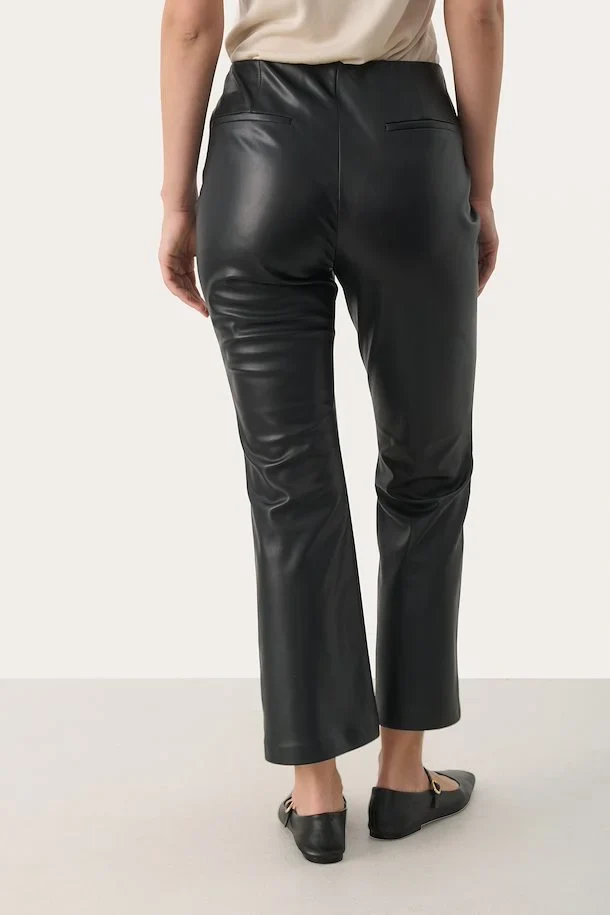 Experience the ultimate blend of style and comfort with our black vegan leather trousers. Featuring a flattering fit and a slight flare, they are perfect for both everyday wear and special occasions. Pair them with an elegant blouse or a casual t-shirt for a versatile look.