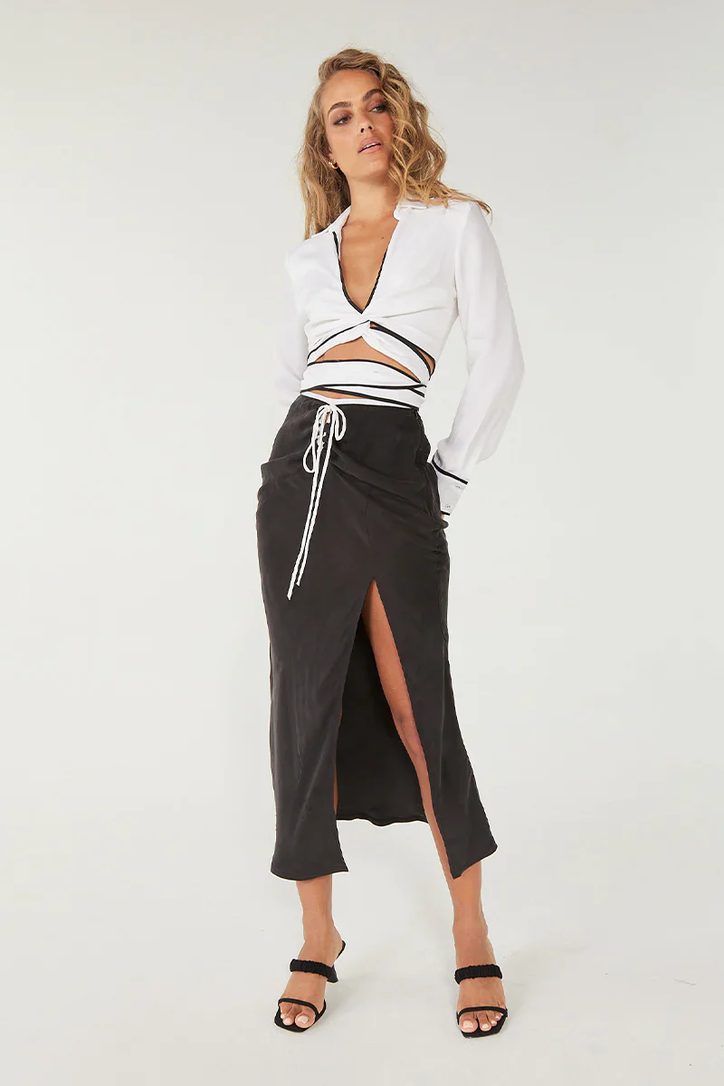 A figure skimming bias cut in a sandblasted twill cupro fabrication with a soft drape -- what more could you want? How about an adjustable drawstring keyhole detail at the front waist in contrasting white and a single leg split for a little skin!Ā This skirt is fully lined with an invisible side seam zipper. The ultimate luxe addition to a seasonless wardrobe. Match it up with the ENCORE TWIST AND WRAP TOP for a head-turning look.